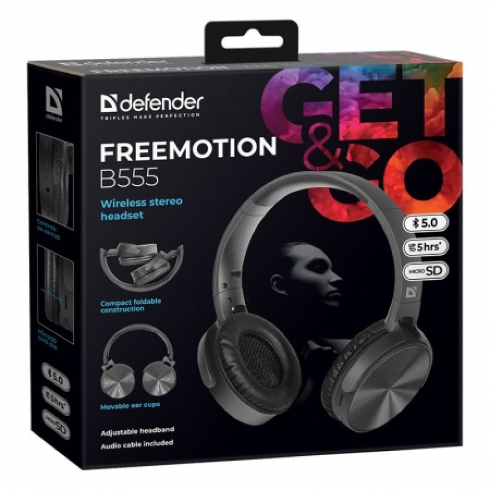 Defender B555 FreeMotion - беспроводная стереогарнитура с MP3-плеером. Наличие Bluetooth интерфейса и встроенный микрофон позволяют общаться по телефону или слушать интернет-радио с ноутбука, свободно перемещаясь по комнате. Регулируемое оголовье дает возможность подобрать наиболее удобную длину дужки. Подвижная конструкция чашек обеспечивает плотное прилегание к ушам и отличную звукоизоляцию. Прием звонков, управление плеером и радио осуществляется с помощью клавиш, расположенных на наушнике. Благодаря складной конструкции наушники удобны для хранения и транспортировки. Источником питания служит встроенный аккумулятор, обеспечивающий до 5 часов автономной работы, а если он разрядится, гарнитуру можно подключить с помощью стандартного 3.5 мм АUX-кабеля.