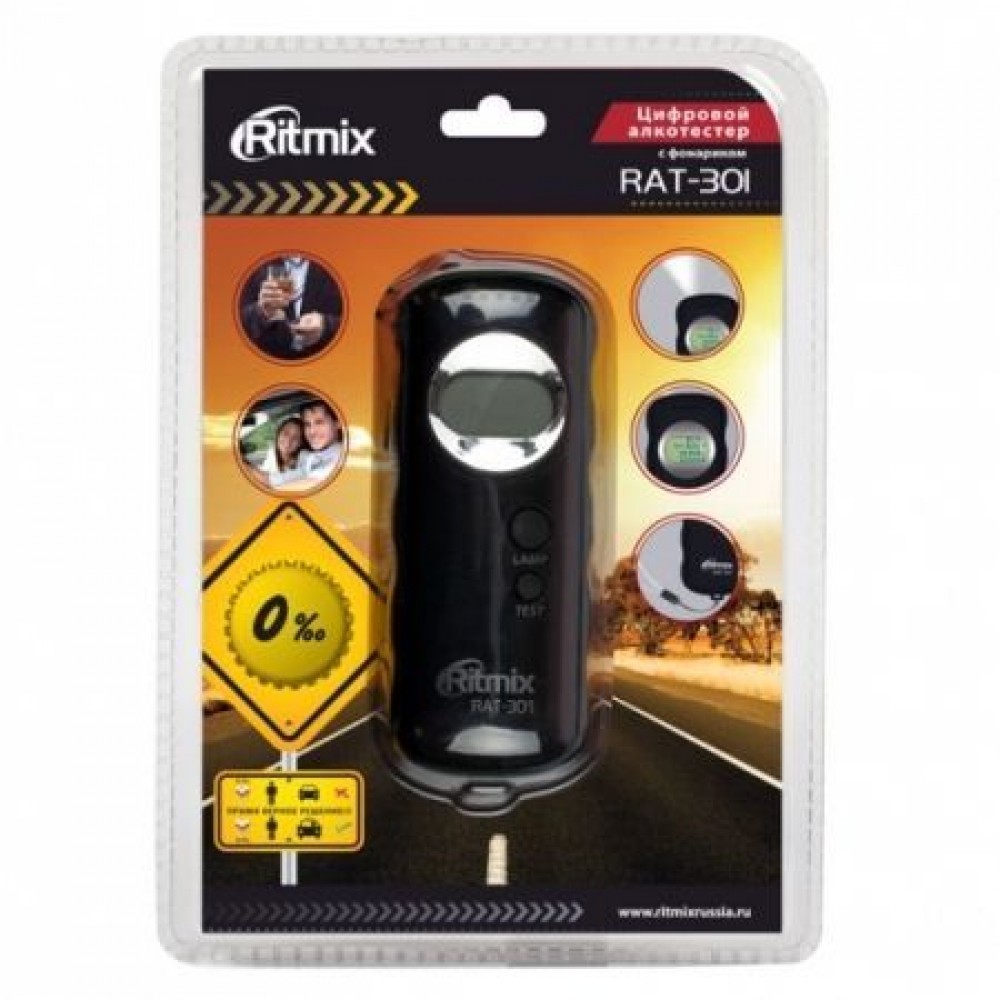 Ritmix RAT-301 - цифровой алкотестер со звуковым сигналом, который предназначен для проведения персонального измерения концентрации алкоголя в парах выдыхаемого воздуха. Прибор пересчитывает полученные данные на концентрацию алкоголя в крови и выдает результат на цифровой дисплей. Алкотестер отличается быстрым выводом результатов, точностью измерения и малыми размерами. Кроме того он имеет встроенный фонарик и удобный ремешок на ношения в руке.  В качестве источника питания используются две батарейки ААА. Функция автоматического отключения питания позволяет продлить срок службы батарей.