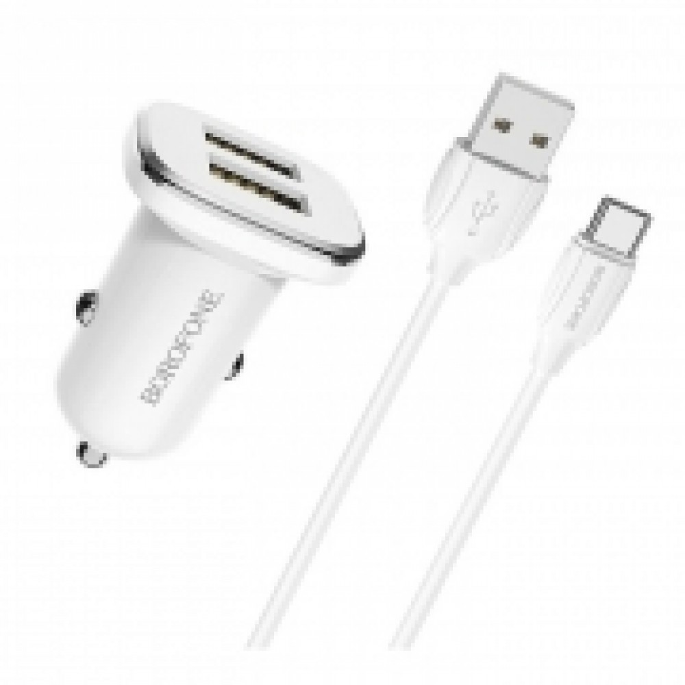 Зарядное автомобильное устройство Borofone BZ12, 2.4A 2xUSB+ кабель Type C, белое