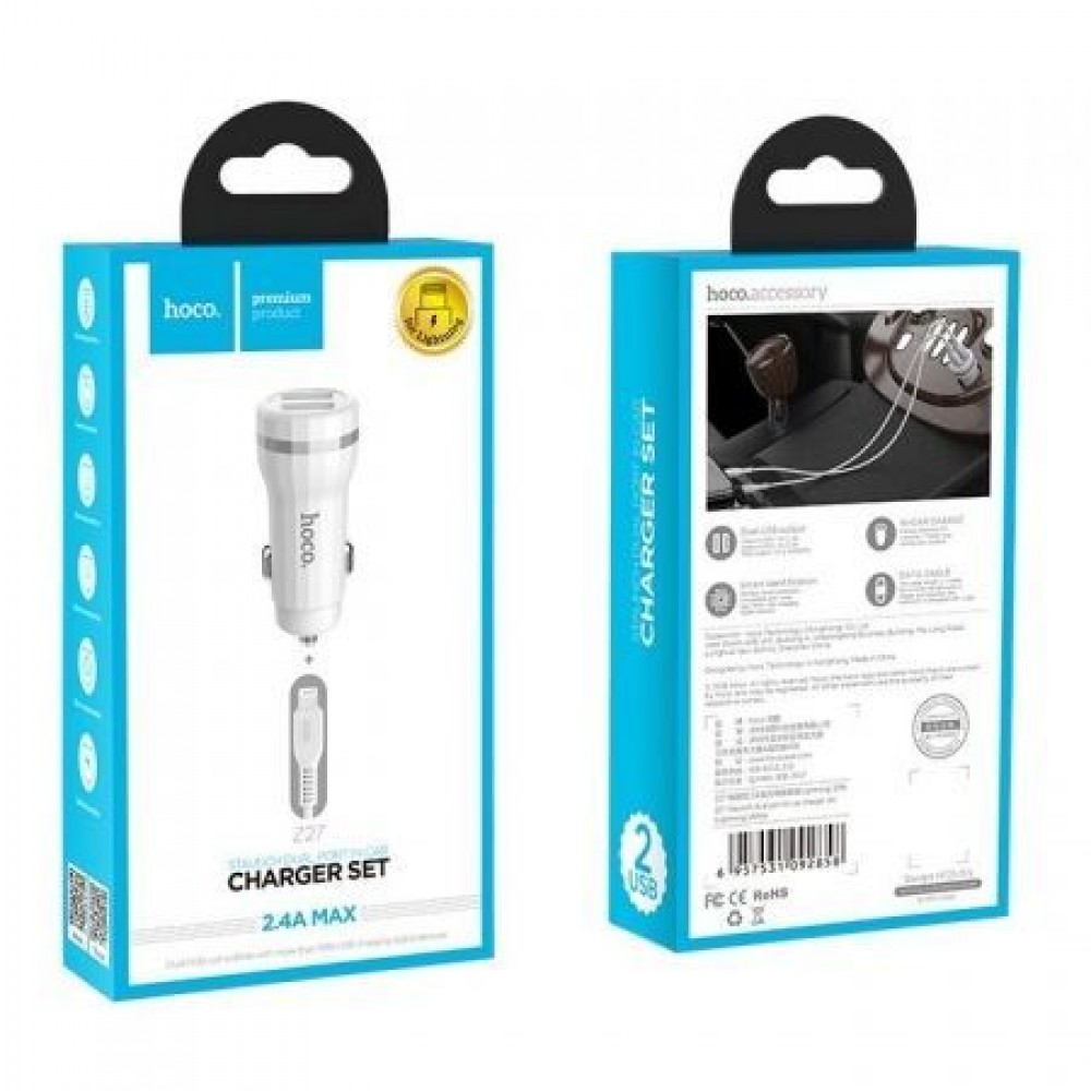 Зарядное автомобильное устройство Hoco Z27 2.4A 2xUSB + кабель Lightning, белое