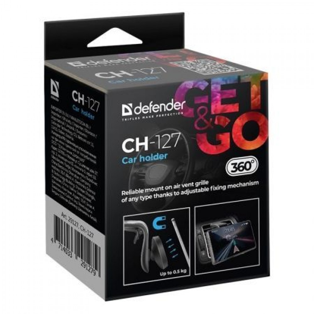Магнитный держатель Defender CH-127 предназначен для смартфона, навигатора и других портативных устройств. Простая установка на вентиляционную решетку и компактные размеры дают возможность брать держатель в путешествия и использовать его на другом автомобиле. Он легко превращается в подставку с несколькими возможными углами обзора для просмотра видео или набора текста. Холдер поворачивается на 360° и фиксируется в любой позиции. Магнитный держатель надежно удерживает мобильное устройство, сохраняя свободный доступ ко всем разъемам и органам управления. В комплект входят две металлические пластины для крепления смартфона на держателе.