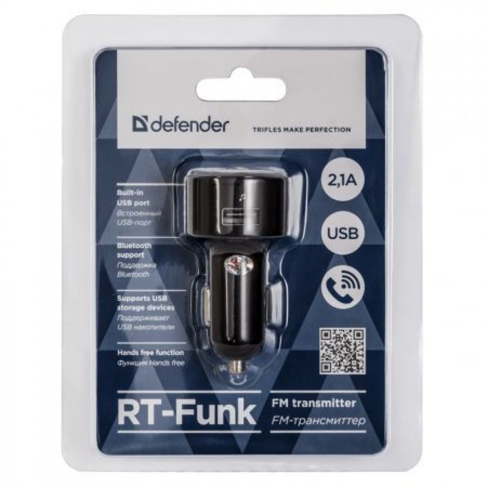 Defender RT-Funk - автомобильный Bluetooth FM-трансмиттер со встроенным зарядным устройством и функцией Hands free. Устройство поддерживает воспроизведение музыкальных файлов с USB-накопителей или через Bluetooth. Также в нем имеется дополнительный USB-порт 2.1A для зарядки мобильной техники. LЕD-дисплей отображает текущий режим воспроизведения и рабочую частоту. Функция Hands free и встроенный микрофон дают возможность отвечать на звонки и общаться через колонку в режиме громкой связи, не доставая телефон.