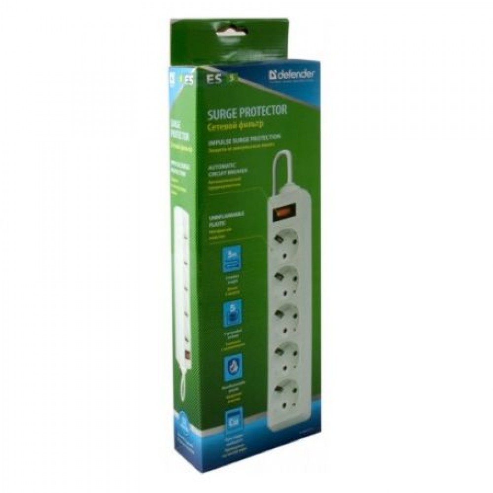 Сетевой фильтр Defender ES предназначен для подключения широкого спектра бытовой и электронной техники. Модель оснащена пятью розетками евростандарта, защищает электронную технику от короткого замыкания, перегрузок по току и импульсных помех. Компактный корпус сетевого фильтра выполнен из прочного негорючего пластика, сетевой шнур и контакты розеток - из чистой меди.