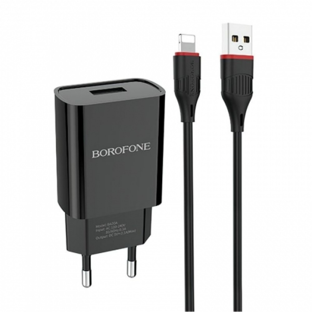 Зарядное устройство Borofone BA20A, 2.1А USB + кабель Lightning, черное
