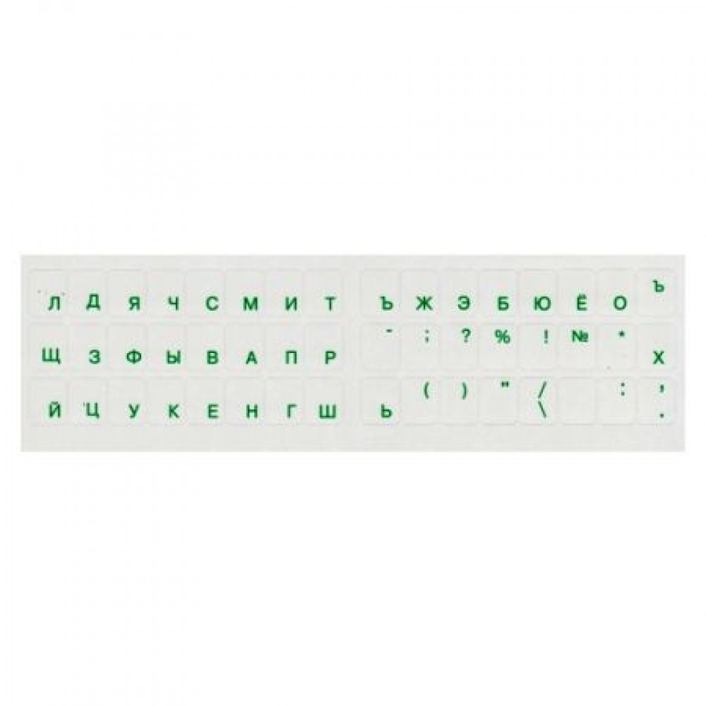 Наклейки на клавиатуру с зелеными русскими буквами, 50 символов. Наклейки выполнены на прозрачной подложке. Самоклеющееся основание прочно удерживает наклейки на клавиатуре. Размеры наклейки: 11 мм (длина) x 13 мм (высота).