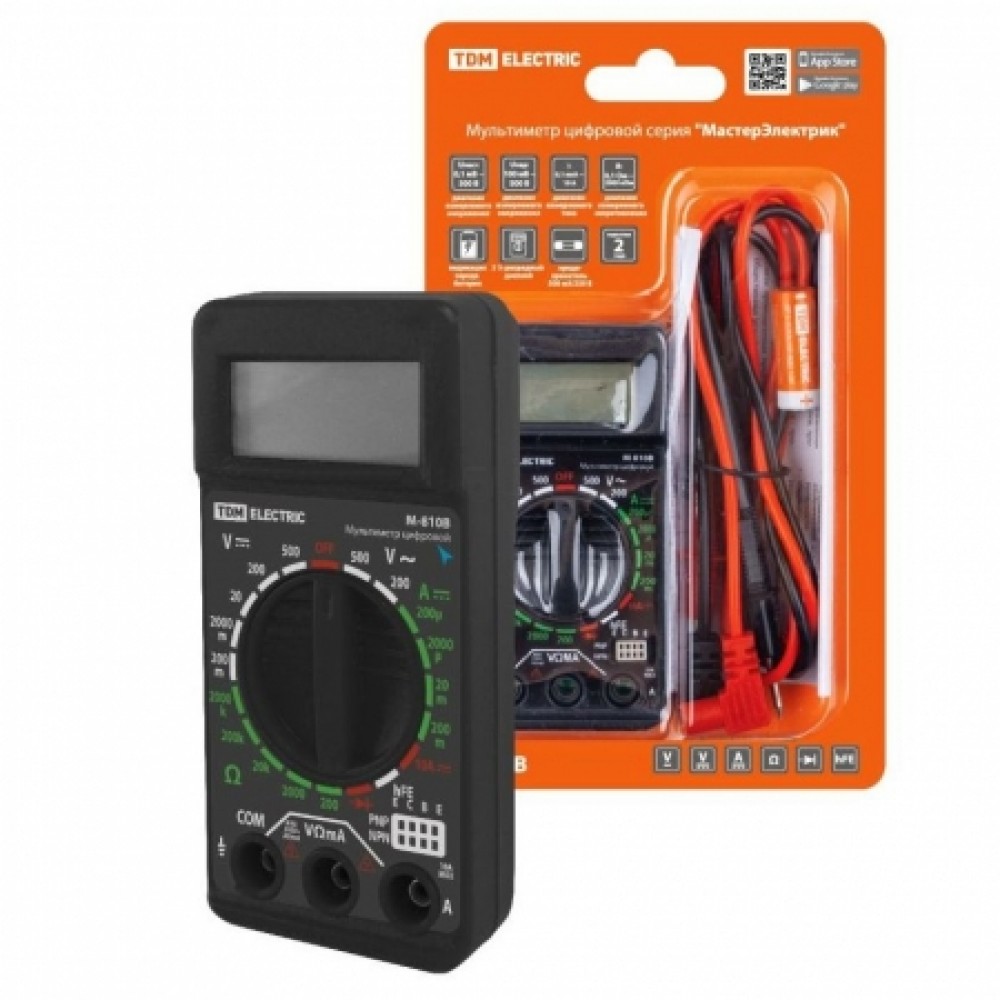 Цифровой портативный мультиметр TDM "МастерЭлектрик" М-810 предназначен для измерения постоянного и переменного напряжения, постоянной силы тока и сопротивления. Кроме того, в устройстве предусмотрен режим тестирования диодов и транзисторов. Это идеальный прибор для использования в лабораториях, цехах, для хобби и работы дома. Прибор оснащен 3,5 разрядным ЖК-дисплеем, переключателем диапазонов измерения и разъемом для тестирования транзисторов. В устройстве предусмотрена защита от перегрузки и индикатор разряда батарей. В качестве источника питания используется одна батарейка A23. В комплект входят два измерительных щупа и элемент питания.