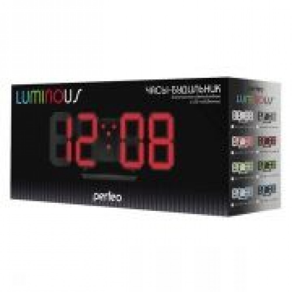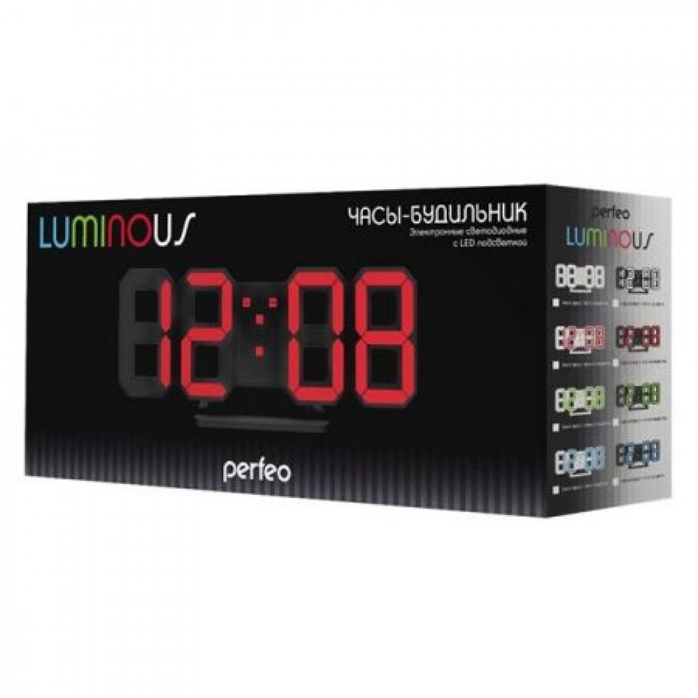 Perfeo Luminous - электронные часы c будильником и большим цифровым LED-дисплеем с автоматической регулировкой яркости. Дисплей устройства выполнен в виде цифр высотой 8 см, отображающих время в 12/24 часовом формате, дату и комнатную температуру. LED-подсветка дисплея может регулироваться автоматически или в ручную, доступно три режима яркости: высокая яркость, стандартная и ночной режим. Будильник поддерживает функции отложенного сигнала и повтора в интервале от 5 до 60 минут. Питание часов осуществляется от USB (также возможно питание от электросети при использовании USB адаптера). Резервное питание от батарейки CR2032 позволяет сохранить настройки времени при выключении электропитания. Часы имеют устойчивое основание и отверстия для крепления на стену. Благодаря оригинальному дизайну часы Perfeo Luminous прекрасно впишутся в современный интерьер.