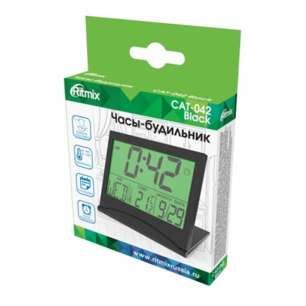 Технические характеристики Часы будильник Ritmix CAT-042, температура, дата, складной корпус, черные
