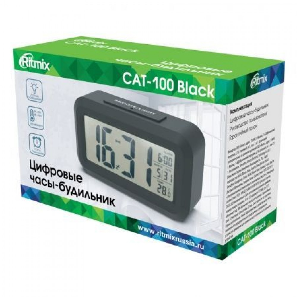 Ritmix CAT-100 - цифровые часы-будильник с подсветкой экрана, датчиком освещенности и комнатным термометром.
