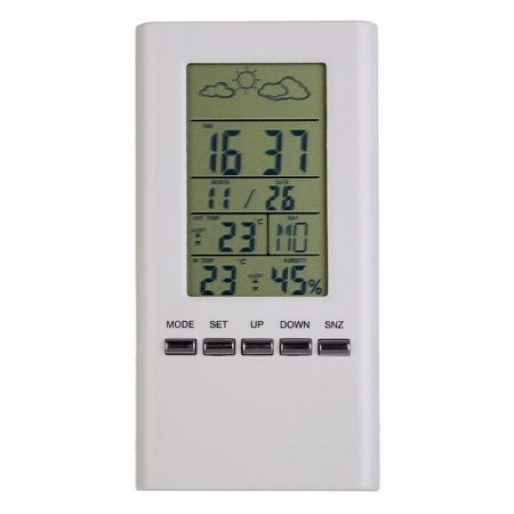 Часы-метеостанция Perfeo Меteo умеют измерять влажность воздуха и температуру в помещении, а также оснащены выносным проводным датчиком для точного измерения температуры за окном. Один взгляд на цифровой дисплей - и ключевые для комфорта семьи параметры под контролем! Предусмотрены встроенный будильник и отображение min/max температуры. Прибор можно разместить на столе или повесить на стену. Питается умное устройство от двух батареек LR1120 (батарейки в комплекте).