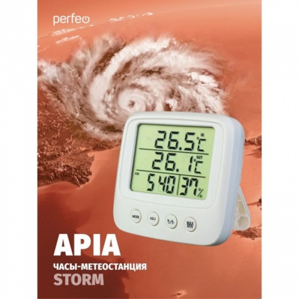 Компактная метеостанция Perfeo «Apia» позволяет измерять температуру и влажность внутри помещения, а также температуру на улице. Среди настроек есть календарь, будильник. Устройство имеет несложное кнопочное управление и низкое энергопотребление (двух батареек ААА хватит на несколько месяцев). И дома, и в офисе метеостанция «Apia» будет полезна и не займёт много места на столе, на любой полочке или на стене (имеет складную подставку и подвес на обратной стороне корпуса).