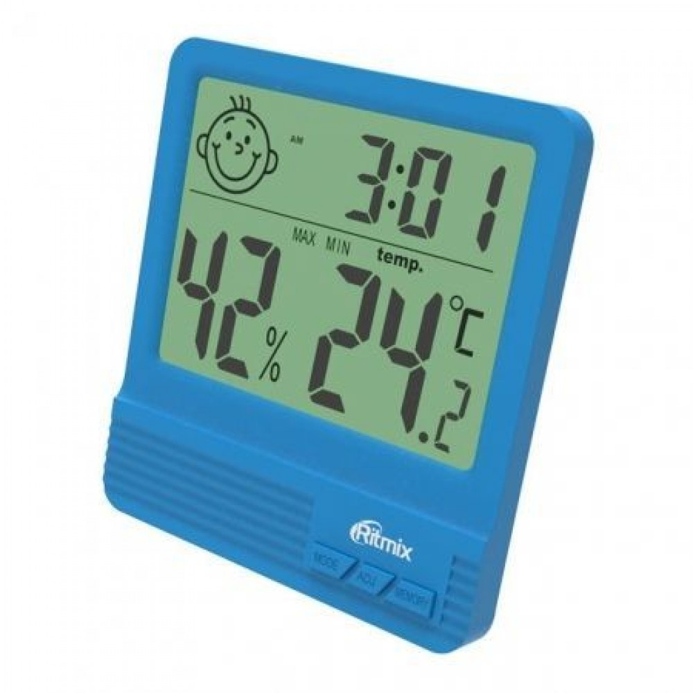 На экране отображается текущее время, показания термометра и гигрометра. При влажности в комнате выше 70% или менее 40% пиктограмма улыбки меняется на пиктограмму огорчения, при возвращении влажности к оптимальным значениям от 40% до 70% на дисплее появляется улыбающееся детское лицо. Среди настроек есть регулировка часов и календаря, отключаемый будильник с повтором сигнала в заданное Вами время, отключаемый режим «электронная кукушка» - короткий звуковой сигнал начала нового часа. Устройство имеет несложное кнопочное управление и низкое энергопотребление (одной «свежей» батарейки типа ААА хватит на несколько месяцев).