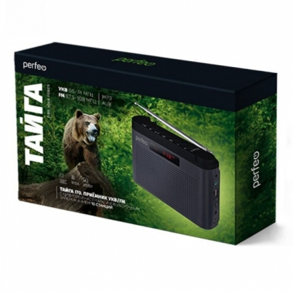 Perfeo Тайга - портативный радиоприёмник с расширенным FM-диапазоном (65,974 МГц / 87,5108 МГц) и MP3-плеером. Модель выполнена в классическом дизайне и имеет стильный внешний вид. Колесико-регулятор радиоволны и панель управления в верхней части корпуса обеспечивают удобное использование устройства. Поворотная телескопическая антенна может принимать сигнал в 2-х самых популярных диапазонах (УКВ и FM), также предусмотрена возможность выборочного запоминания 10 станций. Встроенный MP3-плеер поддерживает воспроизведение аудиофайлов с карты памяти microSD или USB-накопителя. Аудиовход AUX, разъем для наушников и поддержка режима USB-аудио расширяют функционал приемника. За насыщенное звучание приемника и создание эффекта глубины звуковой сцены отвечают два активных 40мм динамика (RMS 6 Вт) и пассивный сабвуфер Bass Booster. Автономная работа осуществляется от встроенного аккумулятора 18650 (1800 мАч), зарядка от USB-порта (кабель micro USB - USB в комплекте) или от сети 220В при использовании USB-адаптера (приобретается отдельно).