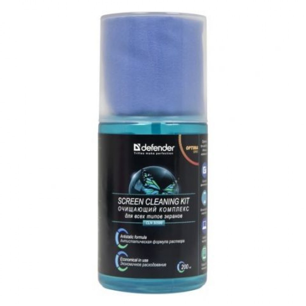 Очищающий комплекс Defender CLN 30598 идеально подходит для всех типов экранов мониторов, телевизоров, ноутбуков, телефонов, а также для всех типов сенсорных экранов планшетов, смартфонов. Жидкость не теряет свойств при хранении даже вскрытой упаковки (не высыхает, не испаряется). Спрей содержит антистатичную добавку, что продлевает очищающий эффект. В комплект входит безворсовая салфетка из микрофибры, которая мягко и эффективно устраняет загрязнения с поверхности экрана.