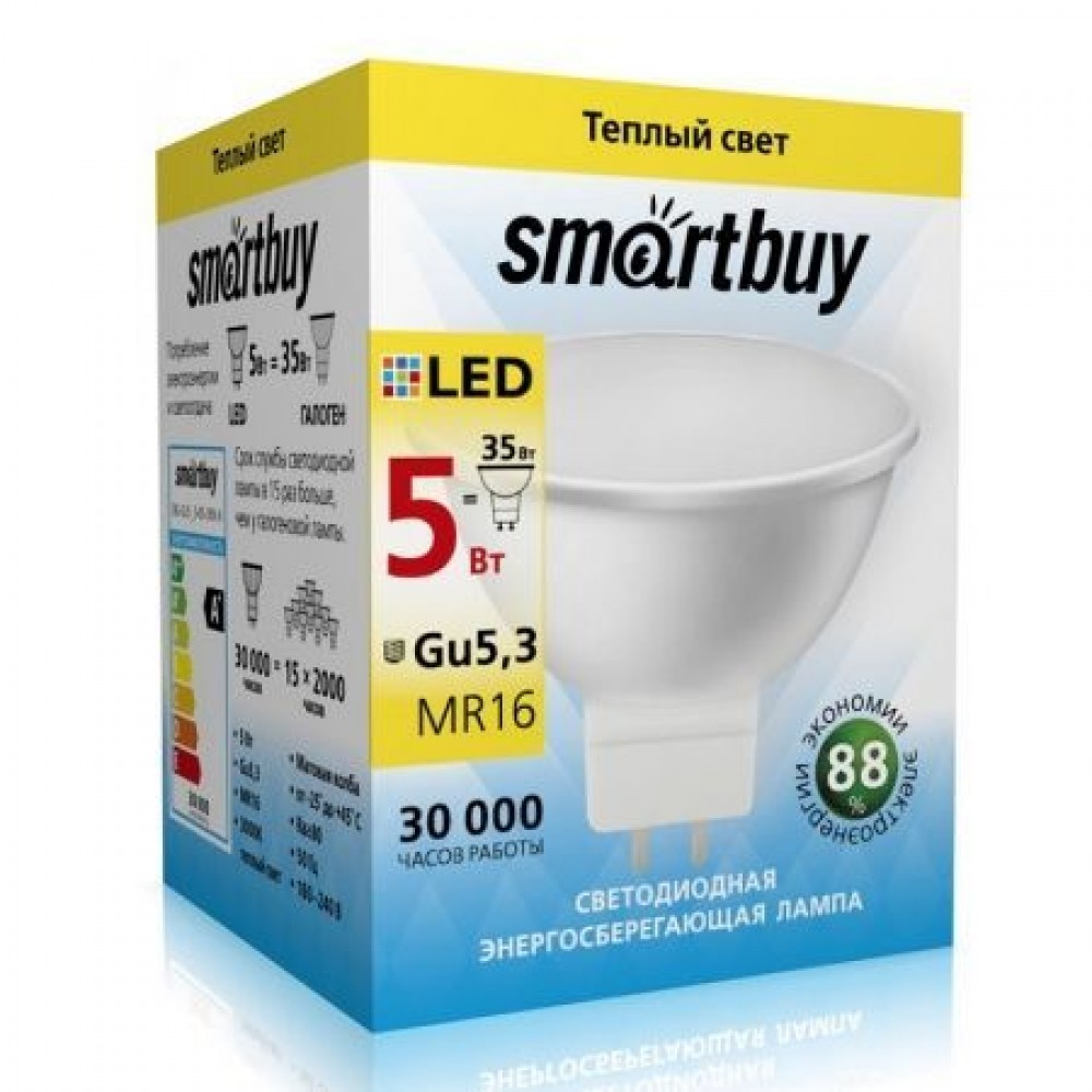 Энергосберегающая светодиодная лампа направленного света Smartbuy Gu5.3 широко используется в помещениях - в различных точечных потолочных светильниках, для украшения витрин, в рекламных конструкциях, вывесках и многом другом. Она повторяет форму и размеры стандартных галогенных ламп MR16, PAR16 и идеально подходит к любому светильнику, в котором используются данные типы ламп. Хорошая цветопередача и отсутствие мерцания обеспечивают меньшую утомляемость глаз. Угол освещения составляет от 40 до 60 градусов. В лампе применяется высокоэффективный драйвер с ресурсом работы до 30 000 часов. Не содержит ртути и экологически безопасна.